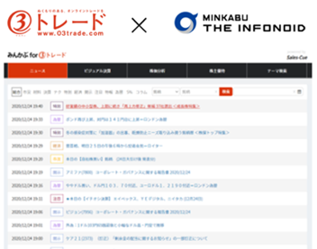 2021年1月,正式向丸三證券提供股票數(shù)據(jù) 2021年1月4日 株式會社みんかぶ與丸三證券聯(lián)手,為投資者推出了名為「MINKABU for 03trade」的服務(wù),為更多的個人投資者提供快速、準(zhǔn)確、全面的金融服務(wù)。